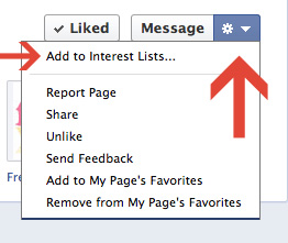 You can also add any page to an Interests list this way.  Under any cover photo, toward the right of your screen you will see the “Like” and Message Interface.  Next to that is a wee “gear”.  Click on it and a drop down appears.  Here you have the option to Add to Interest Lists as well:
