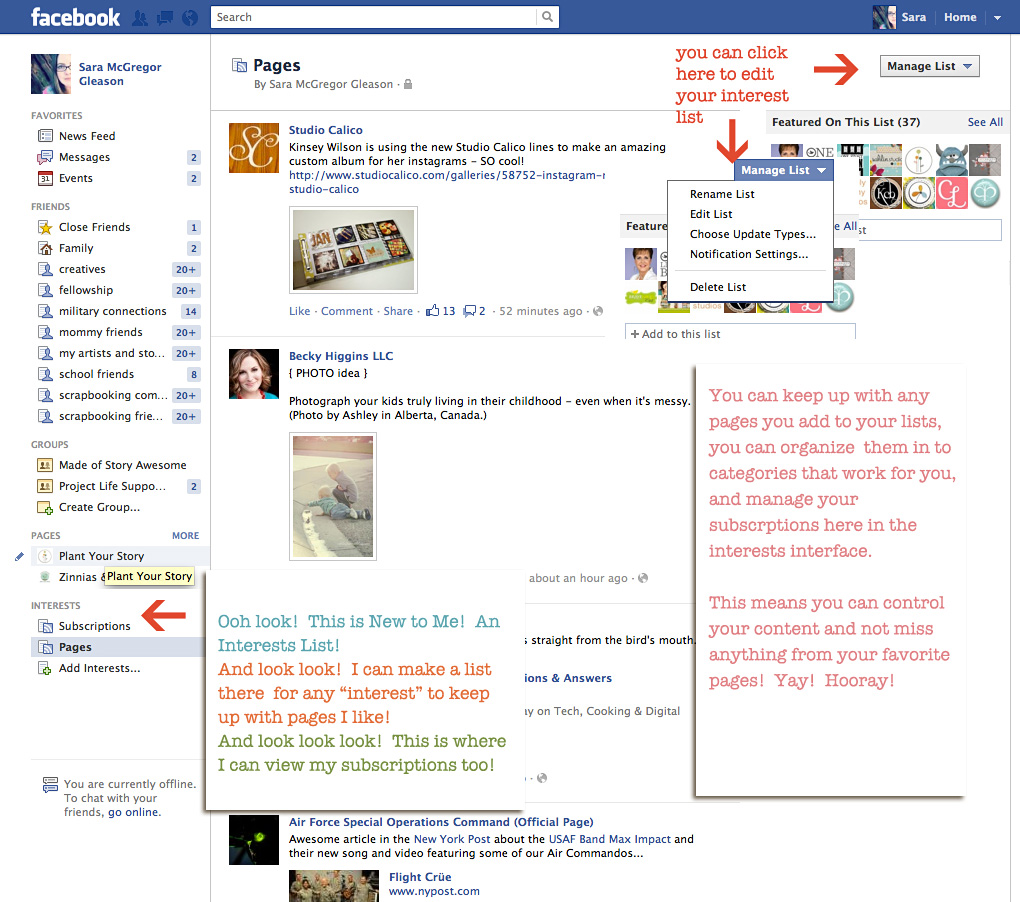 You can create different Interest Lists for different Interests.  I’ve created one for my “favorite” pages.  It includes business connections, scrapbooking and storytelling related pages, and a few other uplifting pages.  And by clicking “Manage lists” you can further control what content you want to see from your Pages.