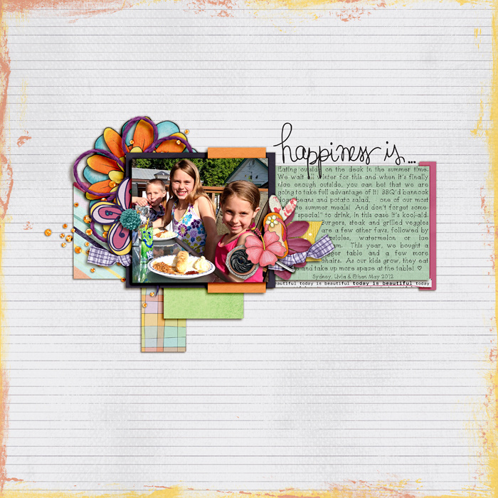 Kimberlee created such a creative and fresh portrait of Happy in her page..which is nothing less than a love story, documented. I so love how she chose to scrap a classic story with bold and vibrant color. This use of color oozes happy. And so do these photos which capture expressions of joy. The real gem is in the delivery of her journaling. She speaks of how happiness and love transcend circumstance. She reveals what truly matters (and what truly brings happiness) by highlighting what doesn’t matter. It’s a powerful perspective.