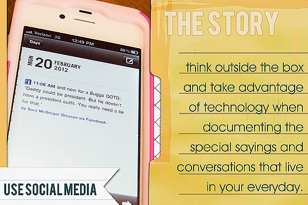 But we were out grocery shopping at the time. So how was I to be sure I would remember this memorable scrappable quotable? Never fear! I simply shared the quote as a Facebook status right after I stopped chuckling. And then I used my Momento app to look back and snag it when I was ready to scrap it: